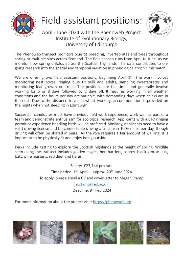 We employ field assistants to work during the period April – June each year. We will advertise here when we are recruiting.